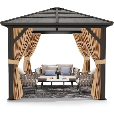 Heavy-Duty Aluminum Frame-This hardtop gazebo¡¯s powder-coated aluminum frame is tough enough to handle whatever Mother Nature throws at it¡ªrain, sun, or wind. It won¡¯t rust, fade, or corrode, so it stays looking sharp for years. Reinforced with pre-drilled holes and ground stakes, it stays locked in place, even in rough weather