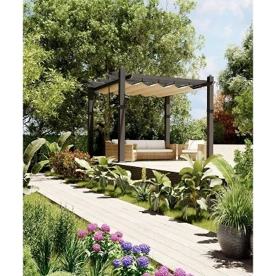 Description: Upgrade your backyard or patio with this 10×10 foot heavy duty aluminum pergola, combining modern style and robust durability. Featuring a powder-coated, rust-resistant aluminum frame with 1mm thick walls, it offers outstanding stability and long-lasting use. The sleek rectangular design integrates discreet drainage channels for effective water management and a refined look. The high-quality polyester canopy with 5+ grade PA coating provides excellent water resistance, UV protection, and fade resistance, easily retracting for custom shade control. Blue curtains add privacy and elegance. Assembly is straightforward with clear instructions. For maximum wind resistance and safety, add weights to the base columns.