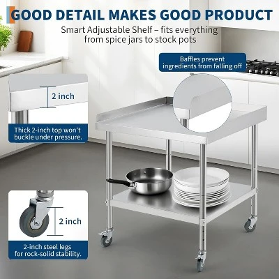 - [Industrial-Grade Thickness & Stability] 2-inch thick tabletop + 1.6-inch shelf + 2-inch diameter legs deliver unmatched durability; 5-inch wheels enable smooth mobility on any surface.