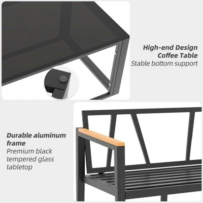 - 【Complete Patio Package】Includes 1 spacious loveseat, 2 accent chairs, 1 sleek coffee table (39.4″×19.7″) with 0.6″ tempered glass top, plus coordinating cushions for each piece.