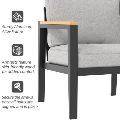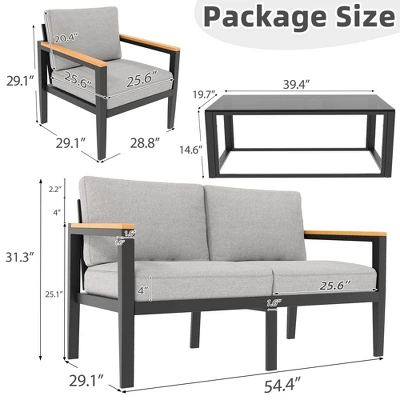 4 Piece Modern Outdoor Conversation Sets with 4 Inch Cushion & 5mm Tempered Glass Table,Aluminum Patio Furniture Set,Outside Furniture Sets Light Grey
