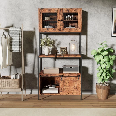 5 Tier Industrial Baker’s Rack with Power Outlets, 63” Tall Microwave Oven Stand with Cabinets & Open Shelves, Farmhouse Coffee Bar Station for Kitchen Living Rooms Apartments, Brown