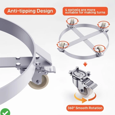 The 55 gallon drum Dolly is made of high-quality carbon steel, with a frame thickened by 0.14 inches/3.5 millimeters, making it sturdy and durable. The galvanized surface has anti-corrosion and waterproof properties. The middle cross band design can avoid warping or tilting, HEAVY DUTY STEEL STRUCTURE.