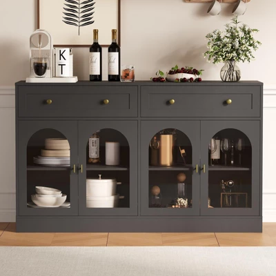 55in Buffet Cabinet with Storage, Farmhouse Sideboard Buffet Cabinet Large Console Coffee Bar Table with 2 Drawers and 4 Acrylic Doors for Kitchen Dining Room Living Room