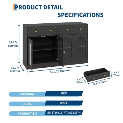 - Ample Storage Space: Measuring 55.12″L x 15.75″W x 33.66″H, this dining room buffet cabinet includes 3 large drawers and 2 cabinets with adjustable shelves. The wide tabletop is ideal for coffee makers, microwaves, or decorative displays