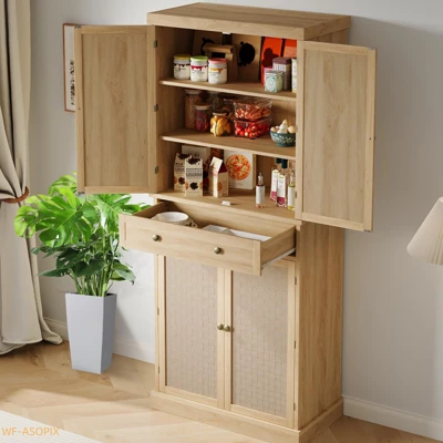 This 72″ tall farmhouse pantry cabinet offers spacious storage with 2 large cabinets, a slide-out drawer, and 4 adjustable shelves supporting up to 60 lbs each. Measuring 30″ W x 16″ D, it holds up to 220 lbs total, perfect for organizing kitchen essentials, dinnerware, and appliances. Featuring braided strip doors and round metal handles, it blends rustic charm with versatile functionality for kitchens, dining rooms, or living spaces. Easy to assemble with included instructions and customer support, this durable cabinet helps keep your home tidy and stylish.