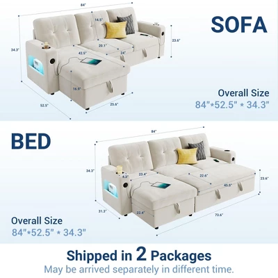84 Inch Sleeper Sofa Couch, L-Shaped Sofa, Convertible Pull Out Sofa Bed with Storage, Charging Station, Led Lights, Modern Sectional Sofa for Living Room, Apartment