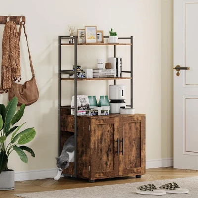 Keep your home tidy and stylish with this spacious Cat Litter Box Enclosure featuring a heavy-duty, reinforced design that fits jumbo litter pans and supports up to 150 lbs. Measuring 19.7″ W x 17″ D x 22.7″ H, it discreetly contains messes while blending seamlessly into your d¨¦cor as a nightstand or end table. This smart 3-tier cabinet offers versatile storage shelves perfect for organizing cat food, pet accessories, books, plants, or decorative items¡ªkeeping your space clutter-free and essentials within easy reach. The dual-door privacy system provides easy cleaning access while offering your feline a comfortable, enclosed bathroom space that helps control odors and reduce stress. Crafted with optimal ventilation to maintain fresh airflow, this enclosure prioritizes your pet¡¯s comfort. The tool-free assembly is straightforward, allowing you to set up your litter box solution quickly and effortlessly. Ideal for living rooms, bedrooms, or bathrooms, this elevated furniture-style litter box enclosure is a stylish and practical upgrade over conventional plastic covers. Dimensions: 19.7 inches width x 17 inches depth x 22.7 inches height Capacity: Supports up to 150 lbs Material: Durable reinforced construction What You Get: One cat litter box enclosure with 3-tier storage and dual doors After-Sales Service: Customer support available for assembly help and product inquiries