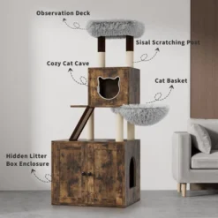 Cat Tree with Litter Box Enclosure 59 Inch Large 2 in 1 Cat Tower Condo with Scratching Post, Dangling Balls, Backet & Top Perch, Wooden Hidden Litter Box Furniture