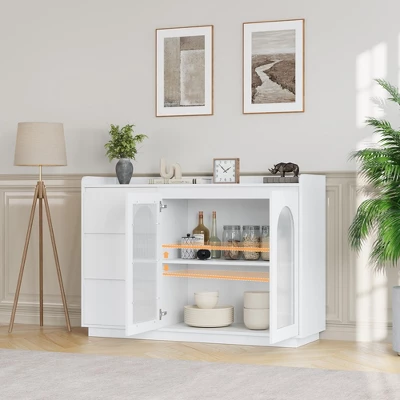 Coffee Bar Cabinet, 48″ Buffet Cabinet Storage Cabinet Sideboard Modern Kitchen Buffet Table with 3 Drawers, Glass Doors 3 Color Led Lights, Coffee Bar for Kitchen, Dining Room Furniture