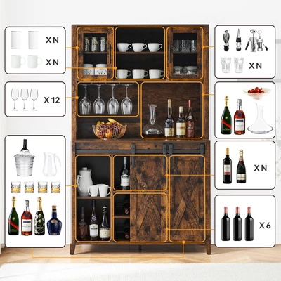 - 【Farmhouse Bar Cabinet with Sliding Barn Door】Featuring two flexible sliding barn doors, this rustic wine cabinet provides easy access to storage while saving space. The sliding door with farmhouse sign create an elegant, farmhouse ambiance in your living space. Flexibly use it as a alcohol cabinet, kitchen pantry, china cabinet, coffee bar station, microwave stand, kitchen cupboard, credenza, storage cabinet.