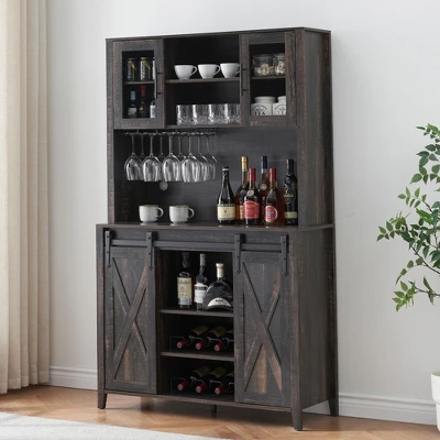 Coffee Bar Cabinet with Sliding Barn Doors, 70” Kitchen Hutch Cabinet with Storage, Wine&Glasses Rack, Tall Sideboard Buffet Cabinet for Kitchen, Dining Room