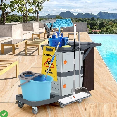 - Three open tiers, twin side cabinets, and integrated hooks keep mops, sprays, and cloths sorted in one rolling station, helping staff move from task to task without hunting for supplies.