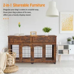 Dog Crate Furniture with 5 Doors, 58″ Wooden Dog Kennel End Table with Large Capacity Drawers, Dog House with Openable Divider for Small/Medium/Large Dog,Dog Cage,Side End Table