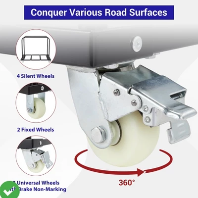 - 4-Inch Silent Wheels: Equipped with 4 heavy-duty wheels, including two 360° rotating brake casters and two fixed casters, this drywall cart allows for easy movement and precise control even in confined spaces.