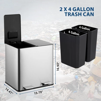 - Included in Your Package: You’ll receive a dual-compartment trash can measuring 15.79 x 14.41 x 16.93 inches, along with two 4-gallon inner buckets and activated carbon fabric in the built-in deodorizer compartment for effective odor control