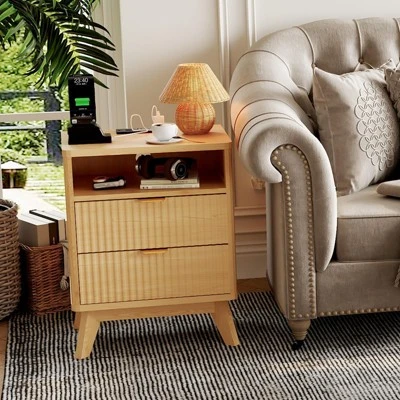 Upgrade your space with this Fluted Nightstand featuring 2 drawers, an open shelf, and a built-in charging station. Designed with elegant fluted details and solid wood legs, it blends seamlessly into bedrooms, living rooms, or studies. Measuring 19.7″W x 15″D x 25.2″H, it offers sturdy support up to 50 lbs while keeping essentials organized. With 2 AC outlets, 2 USB ports, and hidden cable management, you can power phones, lamps, or laptops with ease. A stylish, multifunctional solution for modern living.