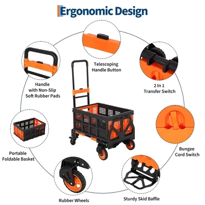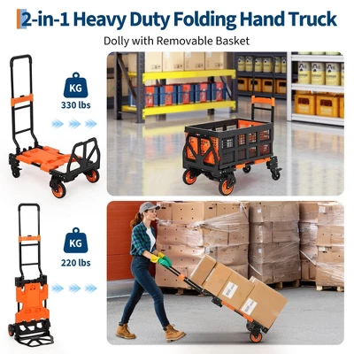 This 2-in-1 folding hand truck seamlessly converts from an upright cart to a four-wheel flatbed, offering versatile utility for moving boxes, furniture, or office supplies. Built with a robust steel frame, it supports up to 330 pounds and features ultra-compact folding for easy storage. The bundle includes a foldable storage basket and elastic bungee rope to secure loads, while smooth-rolling wheels and an adjustable handle deliver ergonomic comfort during transport. Ideal for home, office, and warehouse use with responsive customer support for any issues.