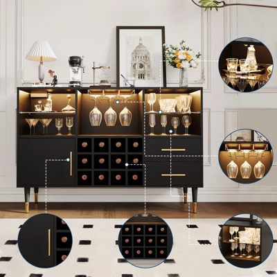 - Organize with Ease: Designed for both style and function, this bar cabinet for home features wine racks, glass holders, drawers, and shelves—providing a dedicated space to neatly display bottles, barware, and coffee essentials all in one modern home bar unit