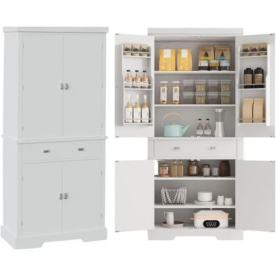 - 【Master Organizer】This 72″ tall pantry storage cabinet comes with 1 large center drawer, 2 large double-door storage cabinets, In addition, the upper door cabinet also has 6 hanging shelves for storing your olive oil, spices and other kitchen items easy to find and access