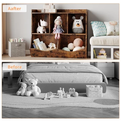 - Practical & Customizable Storage: Featuring 3 open shelves and 2 tilt-out storage bins, this toy organizer offers flexible solutions for tidying up toys, books, and more. The open compartments allow quick access to favorite items, while the removable bins simplify cleanup