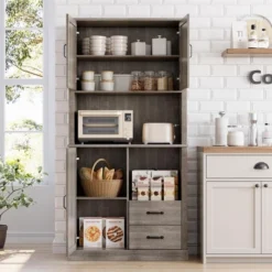 Maximize storage and style with this 71″ tall freestanding kitchen pantry cabinet, featuring 2 drawers, 3 door cabinets, and open shelves ideal for microwaves, dishes, and cookware. Its sleek, modern design with clean lines blends effortlessly into any home d¨¦cor, adding both practicality and sophistication. Built from high-density particleboard, this sturdy cupboard is rust- and moisture-resistant for long-lasting use. Perfect for kitchens, dining rooms, living rooms, or bathrooms, with easy assembly included.