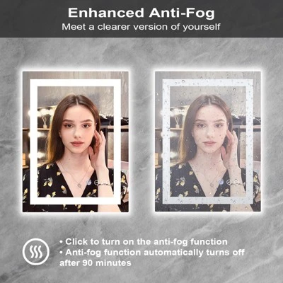 - 💒【Defog Feature & Memory Function】: Fogless mirror with defog function, no worry about wiping the mirror down after a shower. The lighted bathroom mirror is already clean. Anti fog starts quick and one hour auto-off. Memory function helps remember the last setting that you’ve used, smart mirror, smart home.