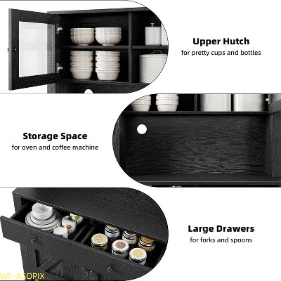 - Smart Dual-Purpose Design This innovative kitchen hutch combines a stable microwave stand with a dedicated coffee bar in one space-saving unit. The reinforced 100lb-capacity top shelf securely holds microwaves or air fryers, while the lower coffee station keeps brewing essentials organized. Perfect for compact kitchens, it eliminates countertop clutter while streamlining your morning routine.