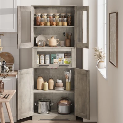 Pantry Cabinet, Tall Bathroom Storage Cabinet with Glass Doors and Adjustable Shelf, Freestanding Cupboard Tall Linen Cabinets for Kitchen, Living Room, Laundry Room