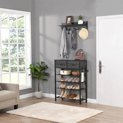- 【Large Storage Capacity】: Our Hallway Unit features four fixed shelves that can hold up to 12 pairs of shoes, two spacious drawers for socks, and five wall hooks for hanging coats and hats.