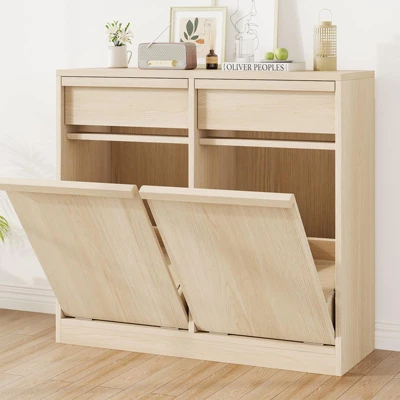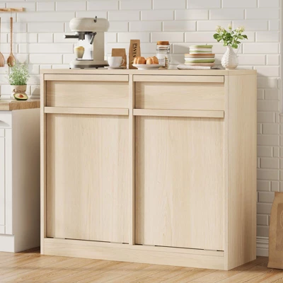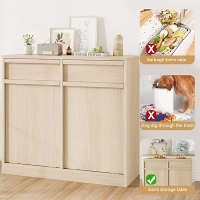 Keep your home neat and stylish with this modern tilt-out trash cabinet, designed to discreetly hide 10-gallon garbage bins while preventing pets from making a mess. The tilt-out front panel makes waste disposal effortless, while the pull-out drawer and spacious tabletop offer extra storage for cleaning supplies or recyclables. Built with reinforced sides and bottom, it supports up to 50 lbs and includes an anti-tip device for added stability. More than just a trash solution, it doubles as a laundry hamper, pet food storage, or even a kitchen island. Easy-to-clean surfaces and simple assembly with labeled parts make it a practical, multifunctional addition to any kitchen, laundry room, or entryway.